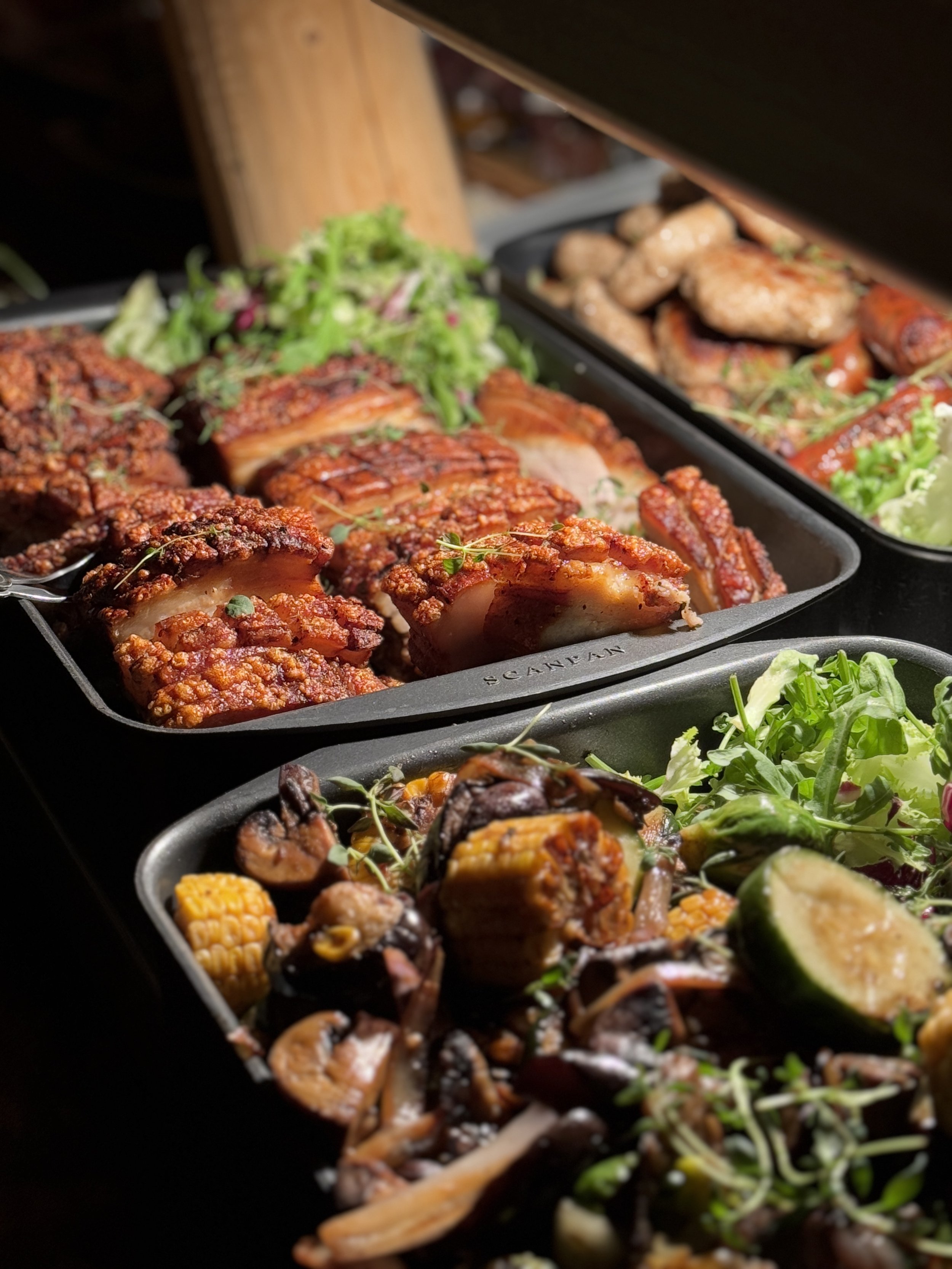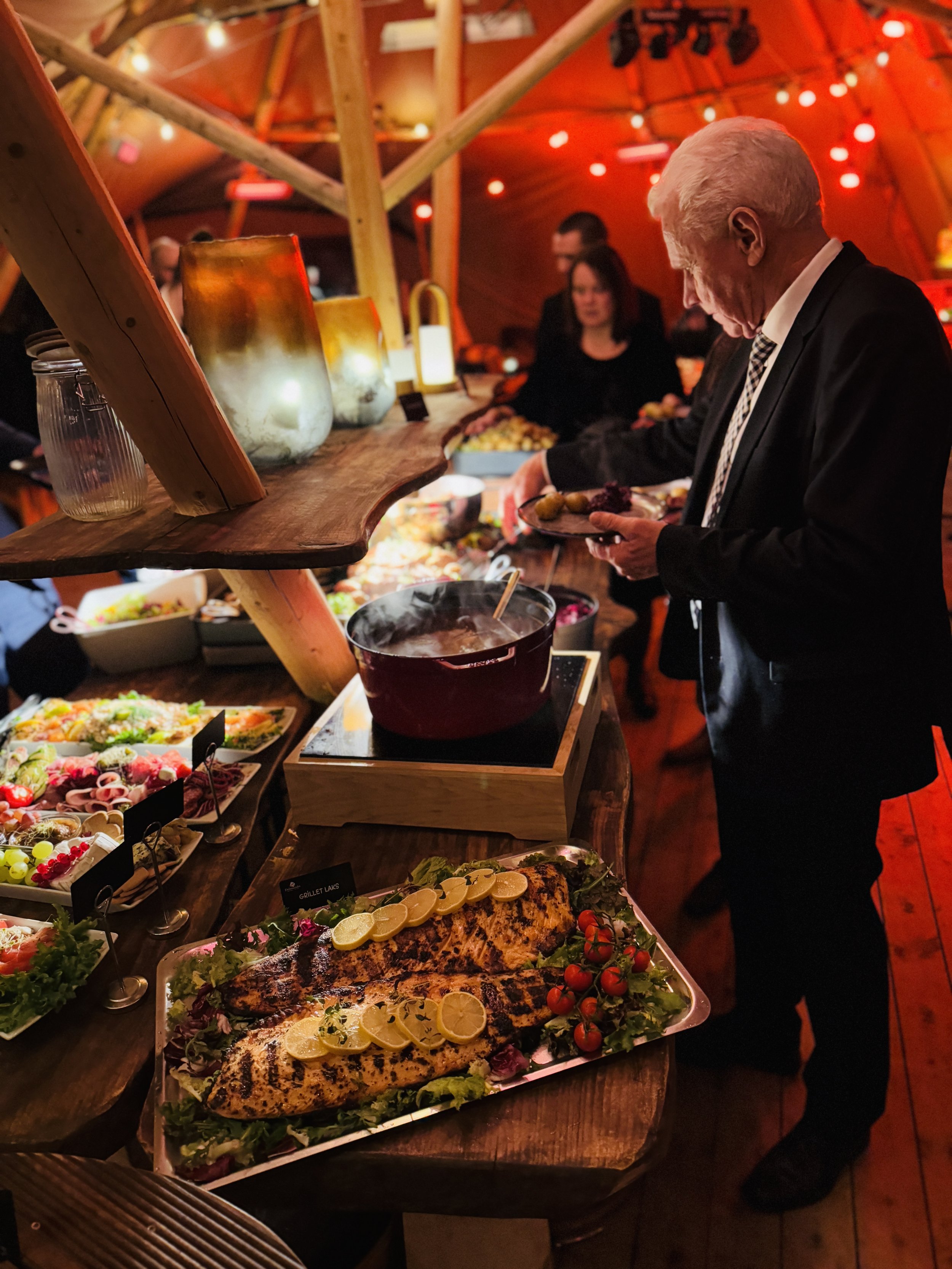 Juleinspirert grillbuffet i lavvoen serveres inne rundt bålet i vår store eventlavvo etter at konkurransen er ferdig og vinnerlaget er kåret. Her venter en bugnende grillbuffet, fylt med både julemat retter og kjøtt, fisk, brød, smør, salater og smakfullt tilbehør.